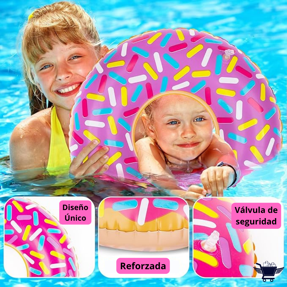 Nuestra Dona Golosa tiene un diámetro de 60 cm. Es ideal para que los chicos se diviertan a lo grande y para que los adultos puedan relajarse y flotar cómodamente. ¡Es el tamaño perfecto para el juego y el relax de toda la familia!